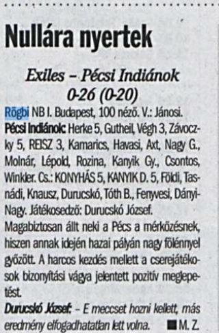 Budapest: Exiles - Pécsi Indiánok 0-26 (0-20) jv.: Jánosi Attila
