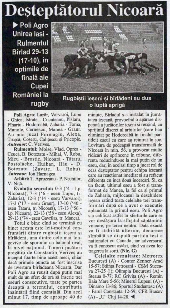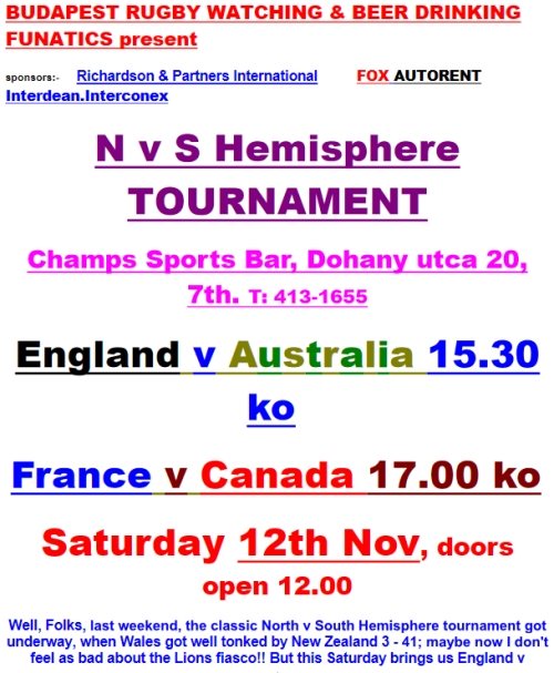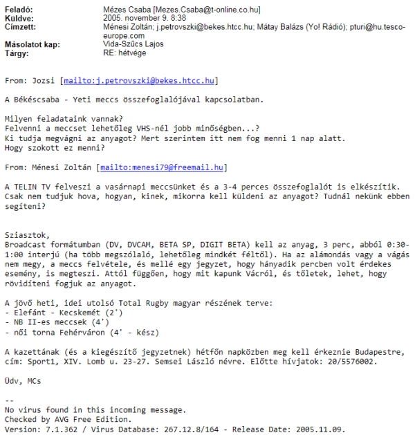 Készülnek a magyarított Total Rugby-k. A fordítócsapat, aki a TV csaotnának előkészíti a szöveget angolból: Argat Zoli, Nikowitz Markó, Túri Pali, Velkovics Vili, Vida-Szűcs Lajos, Lukács Csaba - aki bírja, marja alapon, azaz aki éppen ráér. A határidő 1-2 nap a szöveg keddi kézhezvételétől, csütörtökön már a stúdioban megy az alámondás, hogy hétvégén mehessen ki adásba.