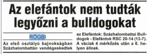 Százhalombatta: Bulldogok - Elefántok 20-14 (13-7) jv.: Priskin István - Békéscsaba