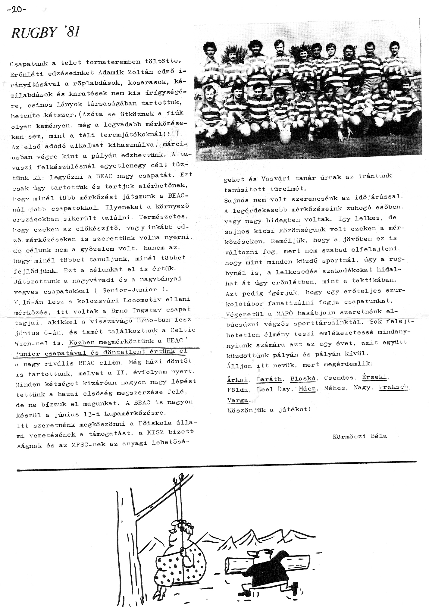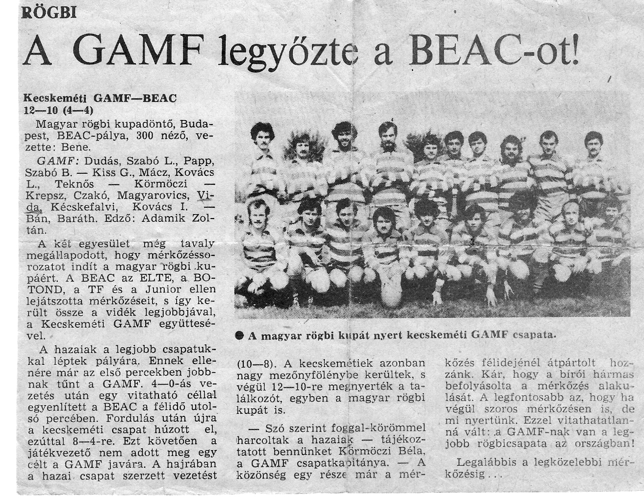 A kecskeméti Gépipari és Automatizálási Főiskolán, azaz GAMF-on, másodévesként akkori tankörpatronáló professzorom, későbbi kollégám a főiskola Elektrotechnika Tanszékén, Körmöczi Béla alapította 1979 őszén a második magyar csapatot a rögbi legújabbkori magyar történetében, így laza és alkalmi szálakkal már akkor kötődtem a sporthoz.