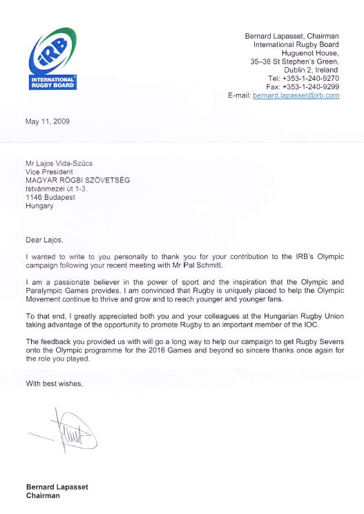 2009. május 29.: a Magyar Rögbi Szövetség Közgyűlése, a szövetség "örökös tiszteletbeli elnöke" címet adományozta részemre.